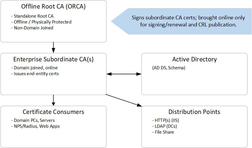 - Prepare at least three servers (or VMs): ONE for the offline root CA (not domain joined), ONE for the enterprise subordinate/issuing CA (domain joined), and ONE or more for hosting HTTP CDP/AIA distribution points (IIS). You will also need a healthy domain controller.